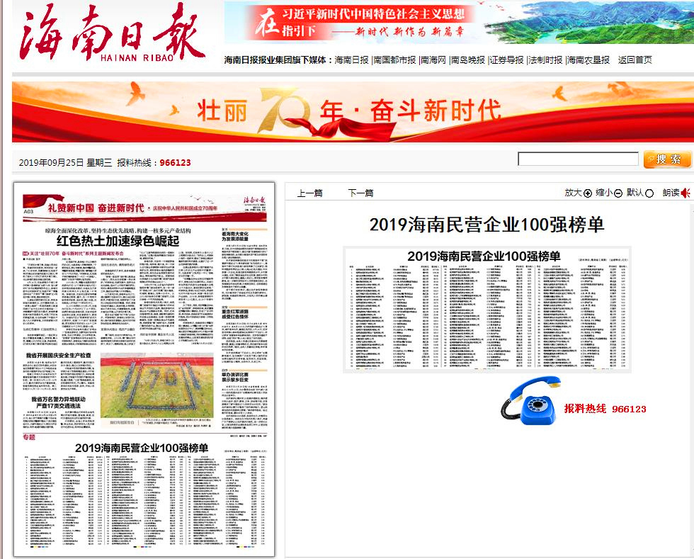 明佳集團被評為“2019海南民營企業(yè)100強”企業(yè)
