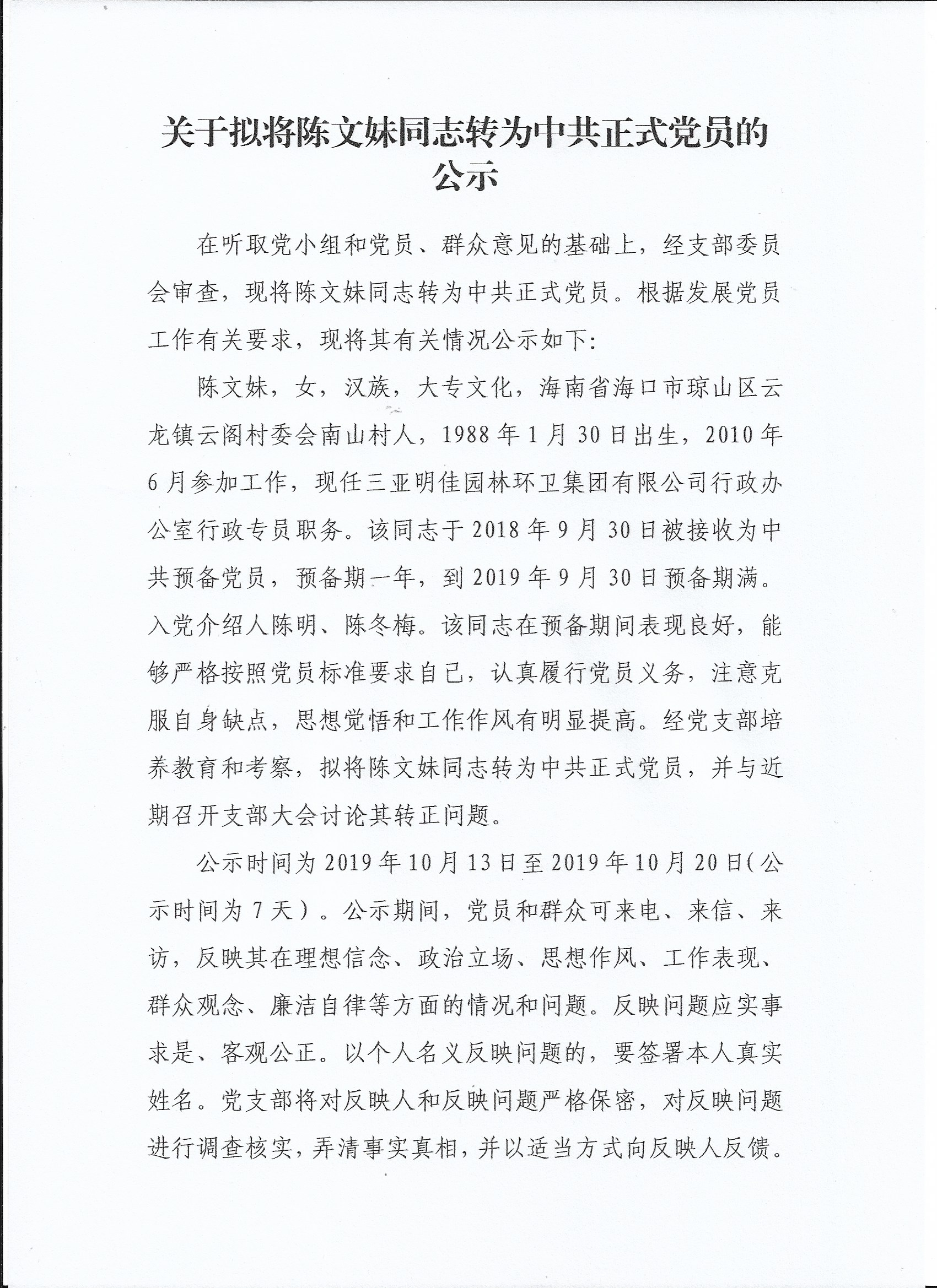 關(guān)于擬將陳文妹同志轉(zhuǎn)為中共正式黨員的公示
